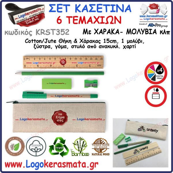 KRST-352 Σετ Κασετίνα από Βαμβάκι & Γιούτα με Χάρακα, Στυλό, Μολύβι, ξύστρα, γόμα με το λογότυπό σας